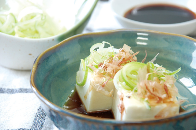食べるサイズに豆腐を切り、醤油をかけ鰹節とネギをのせれば出来上がり。